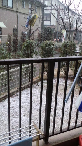 8時頃から雪が降り始めてうちの庭が少し積もってる!